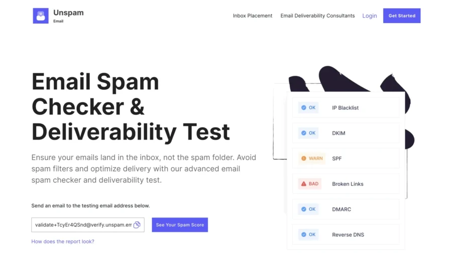 | Unspam Email | Basic spam score, blacklist lookup, and content warnings | Quick basic spam checks for marketing emails |