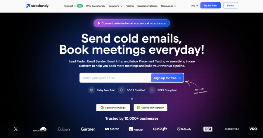 - Saleshandy – $99/month (Outreach Pro) – Unlimited warmup, 5,000 email verification credits, 1 inbox placement test included, plus cold email sequences